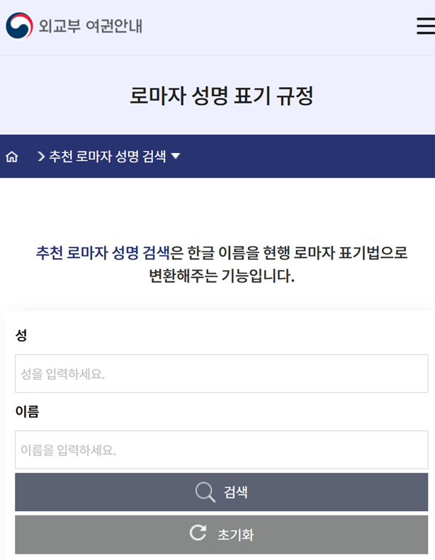 만약 여권 발급과 같이 아주 중요한 일로 영문 이름이 필요하다면 외교부 여권 안내 홈페이지를 이용하는 것이 가장 확실해요. 이 홈페이지의 '로마자 성명 표기'로 들어가면 다른 곳과 달리 성을 적는 칸과 이름을 적는 칸이 명확하게 구분되어 있어요. 그래서 성과 이름을 각각 정확하게 입력하고 검색하면, 여권에 사용되는 공식적인 영문 표기를 틀림없이 확인할 수 있습니다.