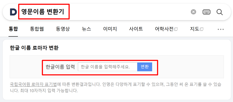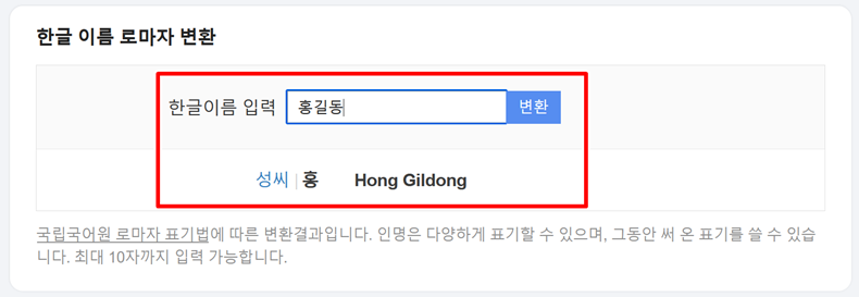 검색을 마치면 바로 '한글 이름 로마자 변환'이라는 창이 나타나는 것을 볼 수 있어요. 사용법은 정말 간단한데요, '한글이름 입력'이라고 쓰인 칸에 변환하고 싶은 이름을 적고 옆에 있는 '변환'을 누르면 돼요. 예를 들어 '홍길동'이라고 입력하니 곧바로 아래에 성씨와 함께 'Hong Gildong'이라고 정확한 영문 표기가 나타나서 신기했어요. 정말 빠르고 편리하게 결과를 확인할 수 있더라고요.
