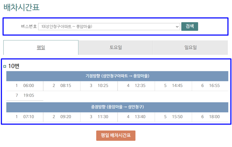 배차시간표 화면에서 제가 궁금했던 10번 버스를 다시 검색했습니다. 검색 결과로 평일, 토요일, 일요일 시간표가 깔끔하게 정리되어 나왔어요. 기점과 종점 방향별로 첫차부터 막차까지 모든 운행 시간을 상세하게 확인할 수 있어서, 제 스케줄에 맞춰 버스를 이용할 계획을 세울 수 있었습니다.