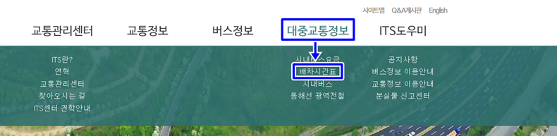 노선도를 확인하고 나니, 이번에는 정확한 배차 시간이 궁금해졌어요. 그래서 저는 다시 홈페이지의 상단 메뉴로 돌아가 대중교통정보에 마우스를 올렸습니다. 그랬더니 아래로 작은 메뉴들이 나타났고, 저는 그중에서 배차시간표를 선택해서 들어갔습니다. 시간표도 여기서 확인할 수 있더라고요.