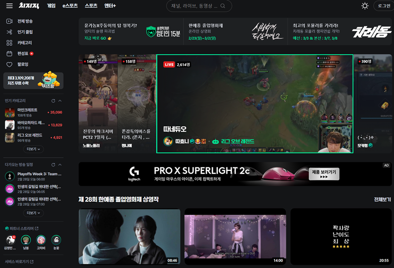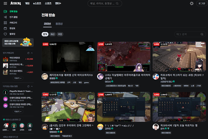 게임을 좋아하시거나 개인 스트리머들의 방송을 즐겨보신다면 이 플랫폼도 분명 마음에 드실 거예요. '치지직'이라고 검색해서 홈페이지에 들어가면 가장 먼저 눈에 띄는 것이 바로 지금 가장 인기 있는 라이브 방송 화면이에요. e스포츠나 신작 게임을 플레이하는 방송들이 주로 보이는데, 꼭 게임이 아니더라도 다양한 주제의 방송들이 많아요. 전체 방송 목록을 보려면 왼쪽 메뉴나 상단 검색창을 활용하면 더 쉽게 원하는 방송을 찾을 수 있습니다.