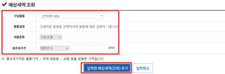 이제 가장 중요한 정보를 입력할 차례예요. '예상세액 조회' 칸에 내가 구매하려는 물품의 종류를 선택하고, 세율 종류는 보통 '기본관세'로 두면 돼요. 그리고 '총과세가격'에는 물건값뿐만 아니라 현지 배송비, 보험료 등 모든 비용을 더한 총금액을 원화로 환산해서 입력해야 해요. 모든 정보를 정확히 넣었다면 아래의 '입력한 예상세액(조회) 추가' 버튼을 눌러주세요.