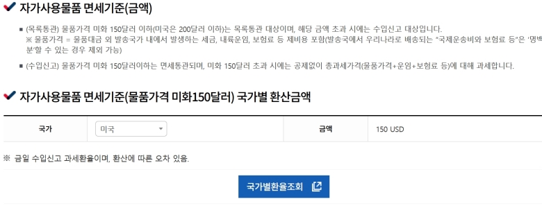 본격적으로 계산하기 전에 기본적인 면세 기준을 알아두면 좋아요. 이 페이지에서는 그 기준을 친절하게 설명해주고 있는데요. 기본적으로 물건 가격이 미화 150달러 이하면 세금이 면제되고, 미국에서 오는 물건은 예외적으로 200달러까지 면세 혜택을 받을 수 있다는 내용이에요. 내가 사려는 물건이 이 기준을 넘는지 먼저 가늠해보고, 넘는다면 세금 계산을 시작하면 된답니다.
