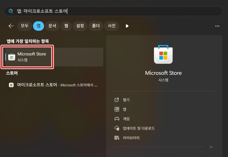 컴퓨터에 깔린 앱들을 어디서 찾아야 할지 막막할 때가 있죠. 먼저 바탕화면 아래쪽에 있는 검색창에 '마이크로소프트 스토어'라고 입력해 보세요. 그럼 쇼핑백 모양의 아이콘과 함께 앱이 바로 보일 거예요. Microsoft Store는 컴퓨터에 필요한 여러 프로그램들을 안전하게 내려받고 관리할 수 있는 공식적인 공간이라, 무언가 필요할 때 여기부터 확인해 보는 습관을 들이면 좋아요. 검색 결과로 나온 'Microsoft Store'를 선택해서 들어가 주세요.