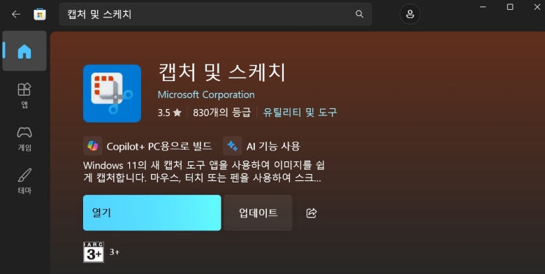검색이 끝나면 관련 앱이 화면에 나타날 거예요. 아마 제일 위쪽에 우리가 찾던 앱이 보일 텐데, 이 항목을 선택해서 상세 페이지로 들어가면 앱에 대한 구체적인 정보가 나와요. 만약 앱이 이미 컴퓨터에 있다면 저처럼 '열기'라고 표시될 거고, 없다면 '설치'나 '받기' 같은 문구가 보일 거예요. 가끔 업데이트가 필요할 땐 '업데이트'라고 나오기도 하고요. 여기서 자신의 컴퓨터 상황에 맞는 버튼을 선택하면 됩니다.