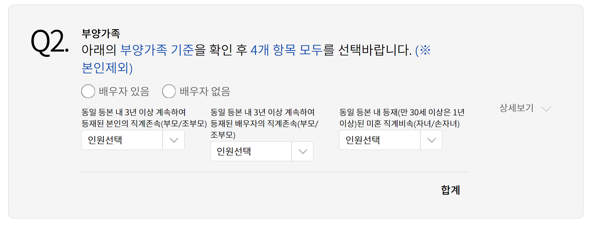 4. 부양가족은 배우자 유무, 본인의 직계존속 인원, 배우자의 직계존속 인원, 미혼 직계비속 인원을 선택 합니다.