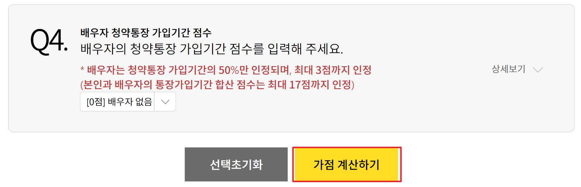 6. 마지막으로 배우자가 있다면 배우자 청약통장 가입기간 점수를 선택 한 후 가점을 계산 해봅니다.