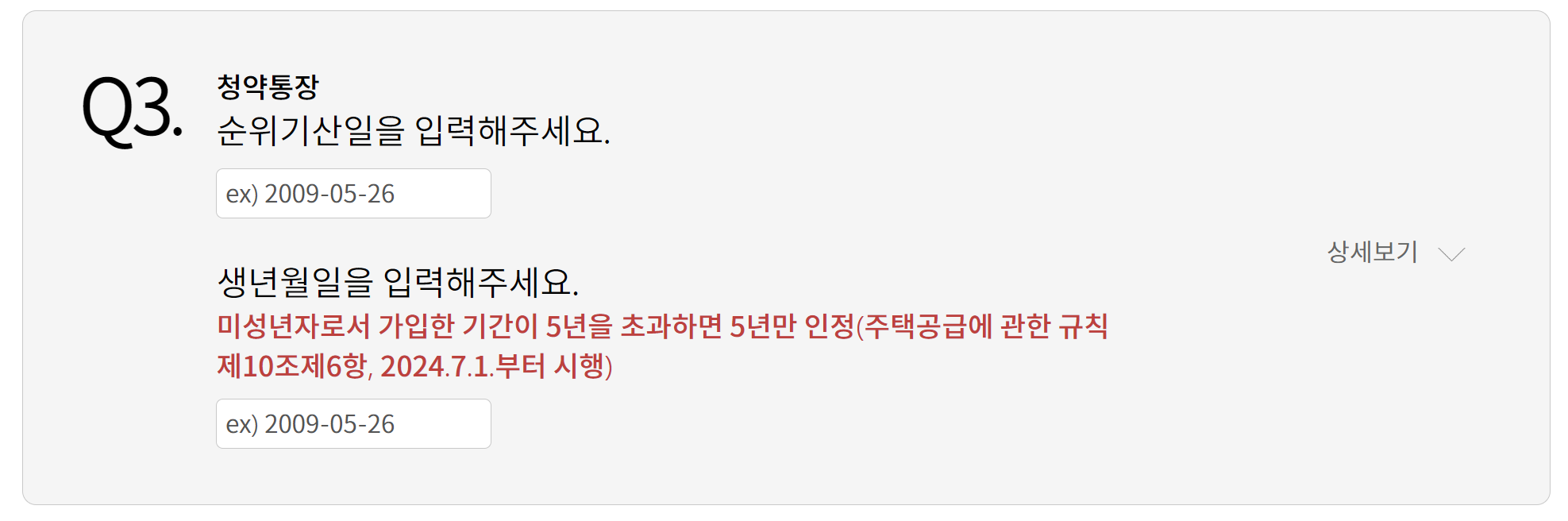 5. 그리고 청약통장의 순위 기산일 및 생년월일을 입력 합니다. 미성년자로써 가입 된 기간이 5년 초과라면 5년만 인정 됩니다.