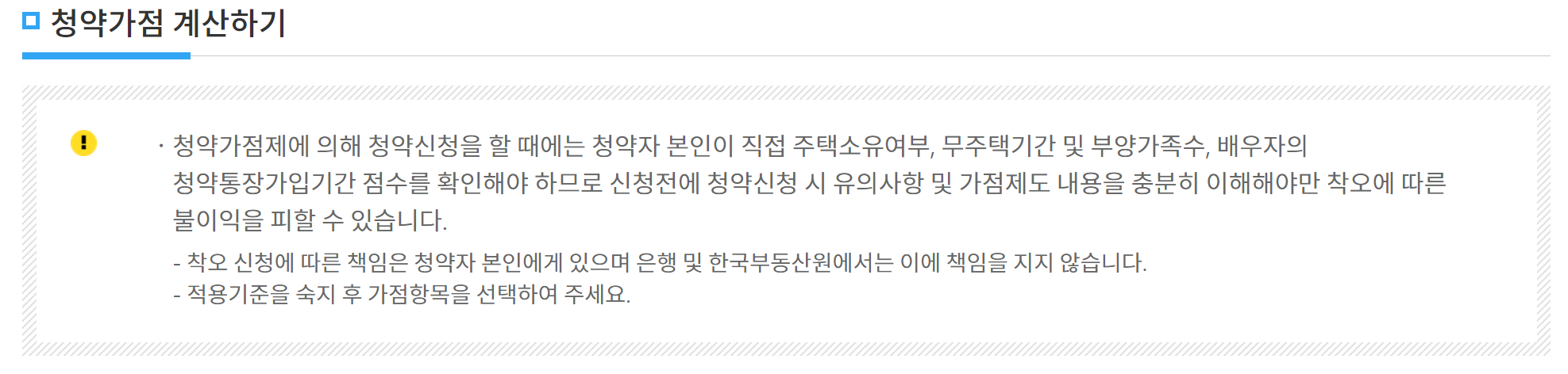 2. 청약가점 계산하기에 앞서서 유의사항에 대해서도 안내가 되어 있습니다. 청약가점제를 통해 청약신청을 할 때는 신청자가 자신의 주택 소유 여부, 무주택 기간, 부양가족 수, 그리고 배우자의 청약통장 가입 기간 점수를 직접 확인해야 합니다. 따라서 신청 전에 관련 유의사항과 가점 제도를 충분히 이해하는 것이 중요합니다. 이를 통해 착오로 인한 불이익을 예방할 수 있습니다. 계산 시에는 실수가 발생 되지 않도록 반드시 적용 기준을 잘 숙지한 후 신청하시기 바랍니다.