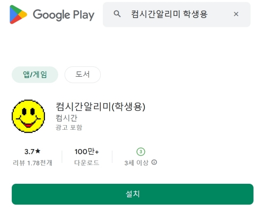 검색하면 노란색 웃는 얼굴 모양의 아이콘이 보일 거예요. 이게 바로 우리가 찾던 앱이에요. 이름이 '컴시간알리미(학생용)'으로 되어 있는지 다시 한번 확인해 보세요. 개발사 이름도 '컴시간'으로 되어 있을 거고요. 평점이나 다운로드 수를 보면 많은 친구들이 이미 쓰고 있다는 걸 알 수 있어서 더 믿음이 가죠. 이제 '설치' 부분을 선택해서 받아주시면 돼요.