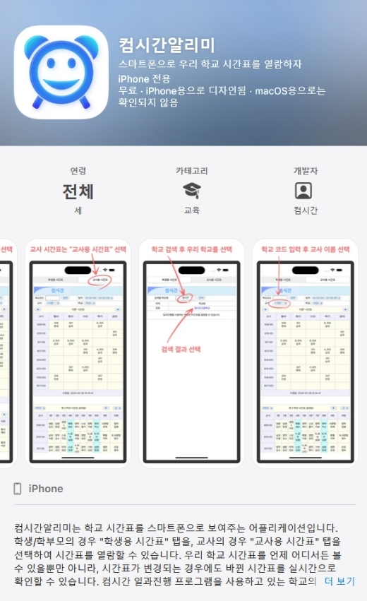 혹시 아이폰을 쓰는 친구들도 걱정할 필요 없어요. 애플 앱스토어에도 똑같이 앱이 있거든요. 사용법도 거의 비슷해요. 앱을 실행하고 '학생용 시간표' 탭을 고른 다음에, 우리 학교를 검색해서 선택하면 돼요. 학교 코드를 입력하라고 나올 수도 있는데, 보통은 학교 이름으로 검색하면 바로 찾을 수 있더라고요. 어떤 폰을 쓰든 편하게 이용할 수 있어서 좋아요.