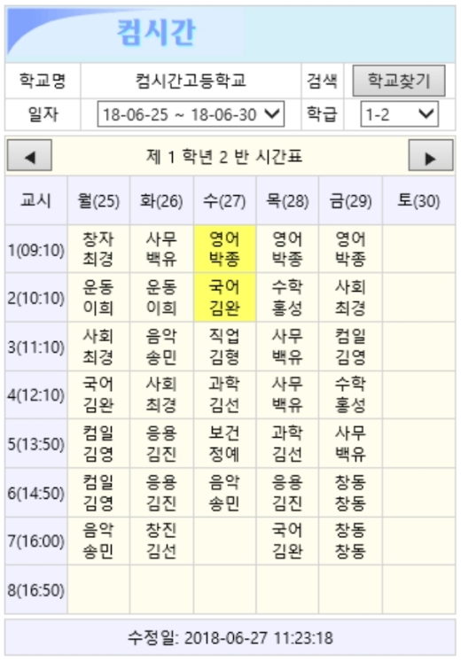 모든 설정을 마치고 나면 이렇게 깔끔한 표 형태로 우리 반 시간표를 볼 수 있어요. 월요일부터 금요일까지, 1교시부터 마지막 교시까지 한눈에 들어오죠. 각 칸에는 과목 이름이랑 담당 선생님 성함이 같이 표시돼요. 예를 들어 '영어 박종' 이런 식으로요. 날짜랑 수정된 시간까지 아래에 나와서 최신 정보인지도 바로 알 수 있어 정말 편해요.
