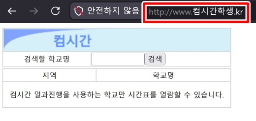 앱 설치가 번거롭게 느껴진다면 컴퓨터나 모바일 웹으로도 볼 수 있어요. 주소창에 '컴시간학생.kr'이라고 직접 입력해서 사이트로 들어가면 돼요. 앱이랑 똑같이 학교를 검색하고 시간표를 확인하는 기능이 다 있답니다. 다만, 주소가 'http'로 시작해서 '안전하지 않음'이라고 뜰 수 있는데, 시간표만 확인하는 거라 크게 걱정할 필요는 없어요.