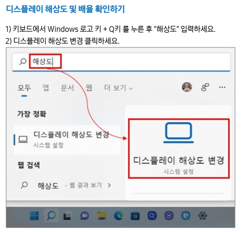 키보드에서 윈도우 로고 키와 알파벳 Q를 함께 눌러주세요. 그러면 화면에 검색창이 나타나는데, 여기에 '해상도'라고 입력하면 돼요. 검색 결과 중에서 '디스플레이 해상도 변경'이라는 시스템 설정 항목이 보일 텐데, 이 항목을 선택해서 다음으로 넘어가 주세요. 설정 창에 들어오면 '배율'과 '디스플레이 해상도'를 조절하는 부분이 보일 거예요.