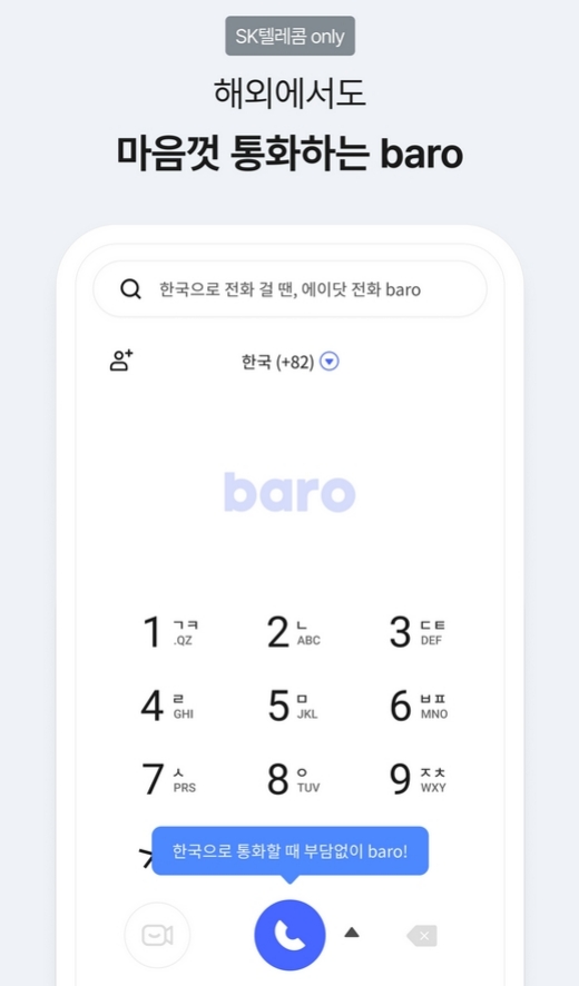 이 기능은 SK텔레콤 사용자분들을 위한 특별한 혜택인데요, 바로 'baro'라는 국제전화 서비스예요. 해외여행이나 출장을 갔을 때 한국으로 전화해야 할 일이 생기면 요금 걱정이 앞서잖아요. 하지만 에이닷 전화 앱 안에 있는 baro를 이용하면 데이터나 와이파이를 사용해서 부담 없이 한국으로 통화할 수 있어요. 해외에서도 마음 편히 통화할 수 있다는 점이 정말 큰 장점이에요.