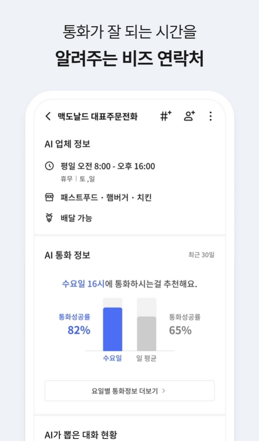음식점이나 관공서에 전화할 때, 점심시간에 걸리거나 영업시간이 아니어서 허탕 친 경험 있으실 거예요. '비즈 연락처'는 이런 불편을 줄여줘요. 특정 사업장에 전화하기 전에 연락처 정보를 보면, AI가 분석한 영업시간 정보나 통화 성공률이 높은 시간대를 추천해줘요. '수요일 16시에 통화하는 걸 추천해요'라는 식으로 알려주니, 헛걸음할 일이 크게 줄어들더라고요.