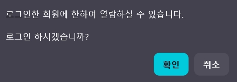 자물쇠 모양 아이콘을 선택하면 바로 화면이 넘어가는 게 아니라 작은 안내창이 하나 뜰 거예요. '로그인한 회원에 한하여 열람하실 수 있습니다'라는 문구가 보이죠. 말 그대로 로그인을 해야만 자료를 내려받을 수 있다는 안내예요. 여기서 계속 진행하려면 망설이지 말고 파란색 '확인' 버튼을 선택해서 로그인 화면으로 이동하면 됩니다. '취소'를 선택하면 이전 화면으로 돌아가니 참고하세요.