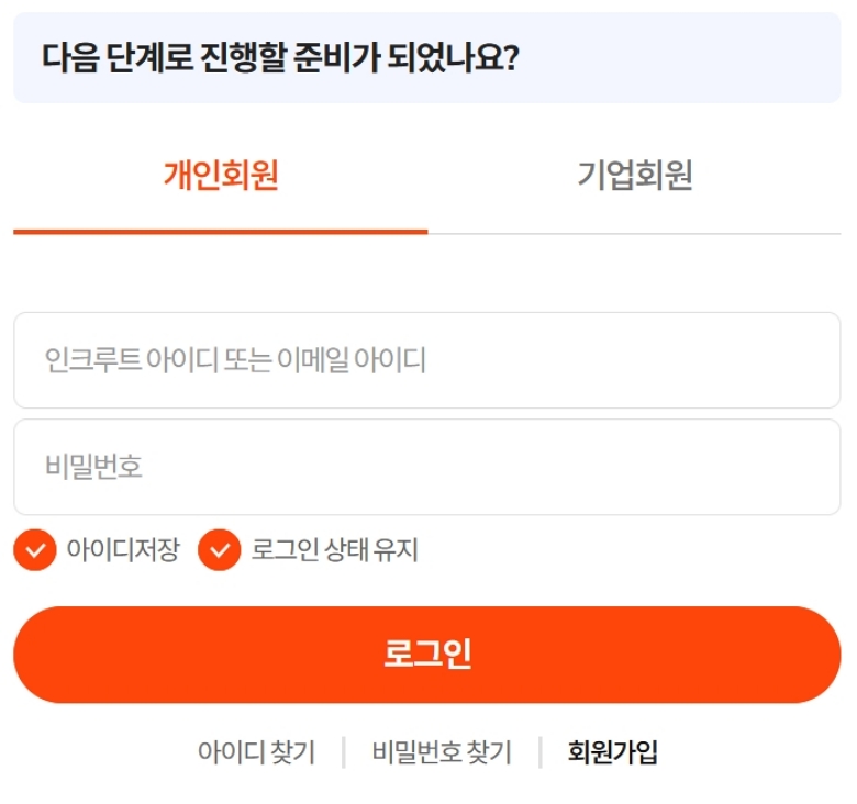'확인'을 선택하면 익숙한 로그인 화면이 나타나요. 기존에 인크루트 아이디가 있으신 분들은 아이디 또는 이메일과 비밀번호를 입력하고 주황색 '로그인' 버튼을 선택하면 바로 서류를 내려받을 수 있어요. 만약 아이디가 없다면 아래 '회원가입'을 통해 간단히 가입 후 이용하시면 됩니다. 한번 가입해두면 앞으로도 다양한 취업 자료를 편하게 이용할 수 있으니 이참에 만들어두는 것도 괜찮은 방법이에요.