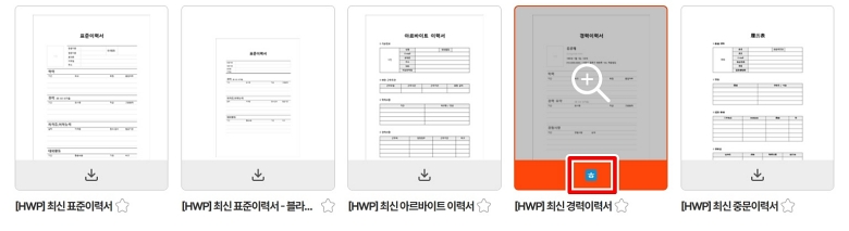 검색을 마치면 조건에 맞는 여러 양식들이 나타날 거예요. 여기서 마음에 드는 디자인을 고르면 되는데, 저는 가장 깔끔해 보이는 '[HWP] 최신 경력이력서'를 골랐어요. 문서를 내려받으려면 이미지 아래에 있는 아이콘을 선택해야 하는데요. 자세히 보니 자물쇠 모양이 그려져 있더라고요. 이건 로그인을 해야만 이용할 수 있다는 뜻이니, 당황하지 마시고 해당 아이콘을 선택해 다음으로 진행하시면 됩니다.