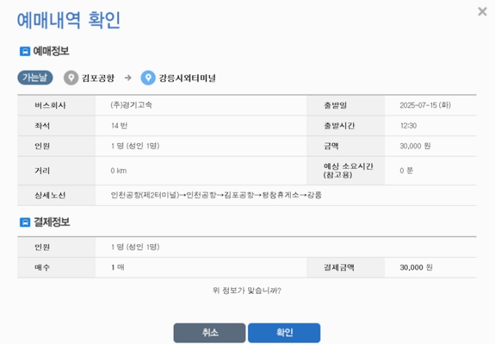 결제하기 전 마지막으로 모든 내용을 확인하는 화면이에요. 여기서 정말 꼼꼼하게 봐야 해요. 내가 선택한 출발지랑 도착지, 날짜와 시간, 좌석 번호가 모두 맞는지 다시 한번 체크해 주세요. 가끔 서두르다 보면 날짜나 시간을 잘못 고르는 실수를 할 수 있거든요. 모든 정보가 정확하다면 아래의 파란색 '확인' 부분을 선택해서 넘어가면 됩니다.