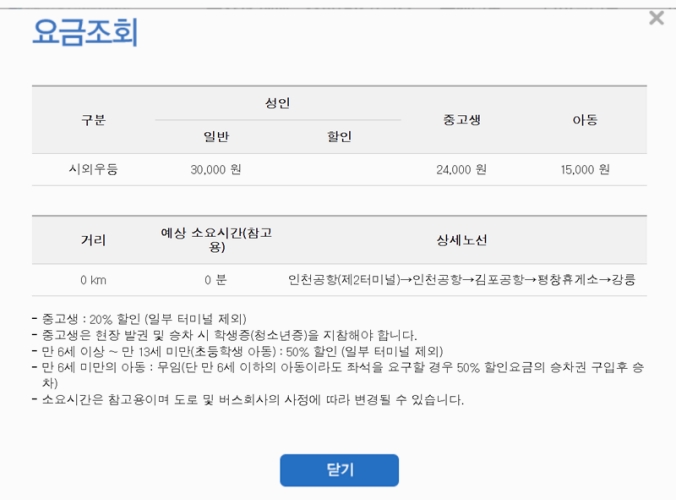 좌석을 정하기 전에 요금이 궁금하다면 '좌석선택' 옆에 있는 '상세보기'를 선택해 보세요. 그러면 새 창이 뜨면서 어른, 학생, 어린이 요금을 각각 확인할 수 있어요. 특히 가족 단위로 여행 갈 때 미리 요금을 확인하면 예산을 짜는 데 도움이 되더라고요. 요금 정보를 다 확인했다면 창을 닫고 다시 좌석을 고르면 됩니다.