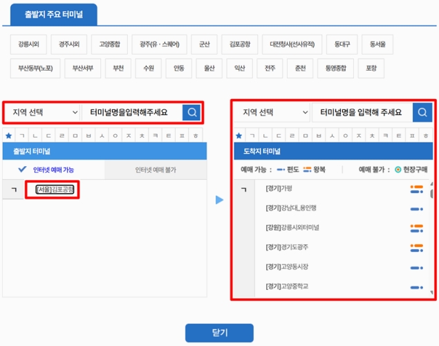 이제 출발지와 도착 터미널을 정확하게 고를 차례예요. 화면이 나오면 먼저 왼쪽에서 내가 출발할 터미널을 찾아 선택해 주세요. 저는 '서울김포공항'에서 출발할 예정이라 그걸로 정했어요. 출발지를 정하고 나면, 오른쪽에는 해당 터미널에서 갈 수 있는 도착지 목록이 쭉 나타나요. 이 목록에서 목적지를 찾아 선택하면 됩니다.