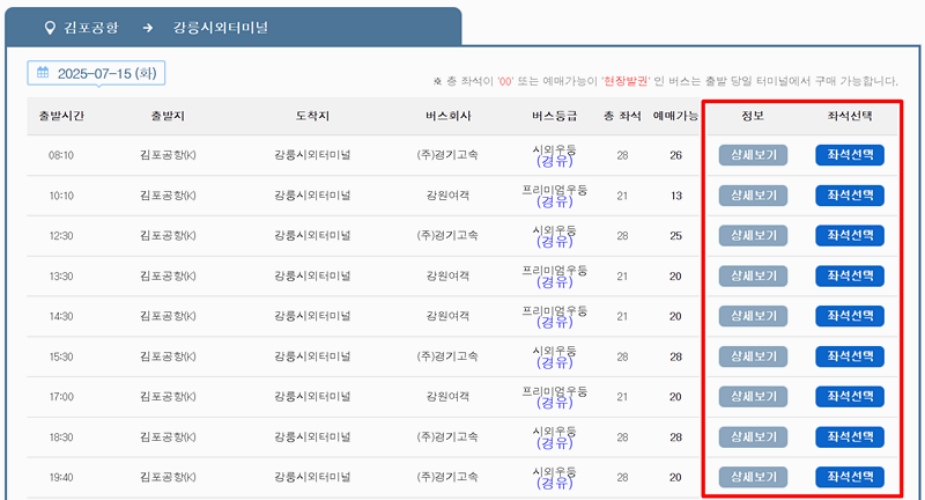 터미널 선택을 마치면, 내가 정한 날짜에 이용할 수 있는 버스 시간표가 목록으로 나와요. 여기서는 출발 시간, 버스 회사, 등급, 그리고 남은 좌석 수까지 한눈에 볼 수 있어서 계획 짜기가 정말 편하더라고요. 저는 제 일정에 맞는 시간을 고른 뒤, 가장 오른쪽에 있는 파란색 '좌석선택' 부분을 선택해 원하는 자리를 고르러 갔습니다.