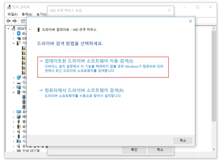 드라이버 업데이트를 선택하면 두 가지 선택지가 나올 거예요. 이때 '업데이트된 드라이버 소프트웨어 자동 검색'을 선택하면 컴퓨터가 알아서 인터넷을 통해 현재 마우스에 가장 적합하고 최신 버전인 드라이버를 찾아서 설치해 줘요. 대부분의 드라이버 문제는 이 과정을 통해 간단하게 해결될 수 있습니다. 설치가 완료되면 컴퓨터를 다시 시작해서 마우스가 잘 움직이는지 확인해 보세요.