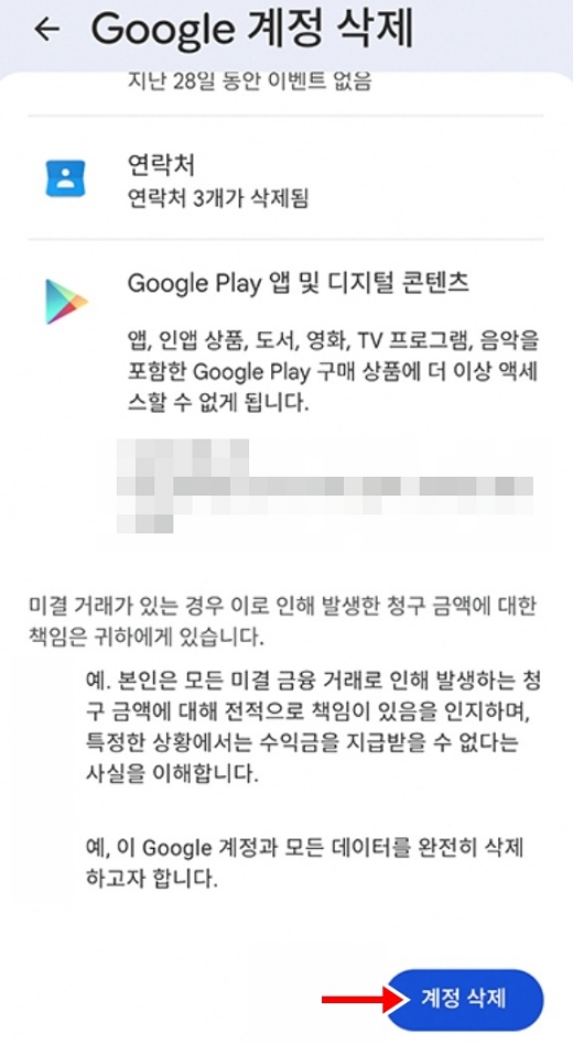 데이터를 백업했다면, 이제 화면을 아래로 내려서 마지막 확인 절차를 진행해야 해요. 여기에는 계정을 삭제했을 때 어떤 서비스들을 더 이상 이용할 수 없는지에 대한 설명과 함께, 모든 내용에 동의하는지 확인하는 과정이 있어요. 예를 들어, 해당 계정으로 구매했던 앱이나 콘텐츠도 모두 사라진다는 내용이죠. 내용을 꼼꼼히 읽어보신 후, 아래에 있는 2개의 동의 항목에 모두 체크를 해주셔야 다음으로 진행할 수 있어요.