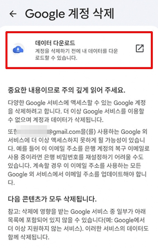 이제 정말 계정을 삭제하는 화면으로 들어왔어요. 여기서 바로 삭제를 진행하기 전에, 아주 중요한 안내 문구가 먼저 보여요. 바로 '데이터 다운로드' 기능인데요. 계정을 삭제하면 그 안에 있던 메일, 사진, 문서 등 모든 자료가 영원히 사라지기 때문에, 구글에서 미리 백업할 기회를 주는 거예요. 저도 혹시나 싶어서 중요한 자료는 없는지 확인하고 백업을 받아뒀어요. 소중한 추억이나 자료가 있다면, 삭제하기 전에 꼭 데이터를 다운로드해서 보관해두시는 걸 추천해요.