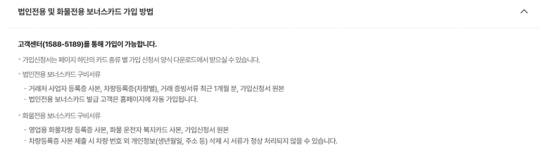 법인이나 화물차 전용 카드는 일반 카드와 달리 신청 방법이 조금 달라요. 온라인으로 바로 되는 게 아니라, 먼저 고객센터(1588-5189)로 연락해서 가입 의사를 밝혀야 해요. 이후 필요한 서류들을 준비해서 제출해야 하는데, 미리 어떤 서류가 필요한지 확인하고 전화하면 두 번 일하지 않아도 되니 참고하세요.