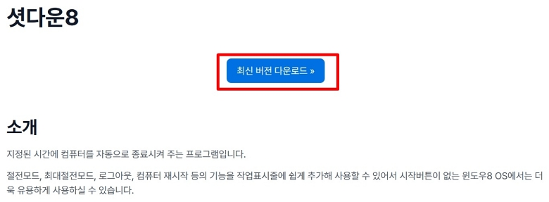 이제 Shutdown8 전용 페이지로 들어왔어요. 프로그램에 대한 간단한 소개 글 아래에 파란색 버튼이 하나 보일 텐데요. 이게 바로 설치 파일을 받을 수 있는 버튼이에요. '최신 버전 다운로드'라고 적힌 이 버튼을 선택해서 파일을 받아주세요. 설치 과정은 정말 간단해서 따로 설명할 필요도 없을 정도예요.