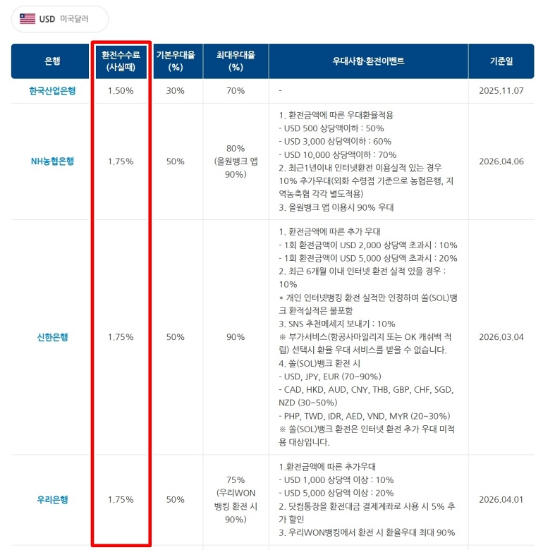 화폐를 선택하고 나면 드디어 우리가 원하던 비교표가 나타나요. 이 표에는 여러 은행의 이름과 함께 수수료 정보가 쭉 나열되어 있는데요. 여기서 우리가 집중해서 봐야 할 부분은 바로 '환전수수료(사실때)' 항목이에요. 우리가 원화를 달러로 '사는' 입장이기 때문이죠. 언뜻 보면 대부분 은행의 수수료가 1.75%로 비슷해 보일 수 있지만, 자세히 보면 1.50%처럼 조금 더 낮은 곳도 있다는 걸 발견할 수 있어요.