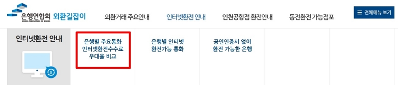 '인터넷환전안내'로 들어가면 몇 가지 세부 항목이 나타나는데요. 여기서 우리가 찾아야 할 것은 '은행별 주요통화 인터넷환전수수료 우대율 비교' 메뉴예요. 이 메뉴를 선택하면 각 은행의 환전 정보를 하나하나 찾아볼 필요 없이, 한 페이지에서 표로 깔끔하게 정리된 내용을 볼 수 있어요. 시간도 아끼고, 여러 정보를 한눈에 비교할 수 있어서 가장 효율적인 방법이라고 할 수 있죠.