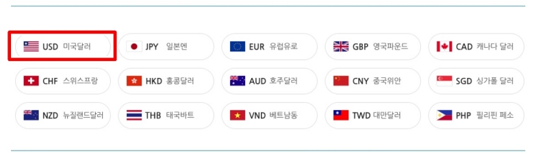 이제 본격적으로 비교를 위해 우리가 바꿀 화폐를 정해야 해요. 일본 엔, 유럽 유로, 영국 파운드 등 다양한 국가의 화폐 목록이 나타날 텐데요. 저는 미국 달러가 필요하니 목록에서 'USD 미국달러'를 선택했어요. 보통 가장 많이 찾는 화폐라 맨 위에 있어서 찾기 쉬울 거예요. 내가 바꾸고 싶은 화폐를 정확하게 선택해야 그에 맞는 수수료와 우대율 정보를 확인할 수 있으니 잊지 마세요.