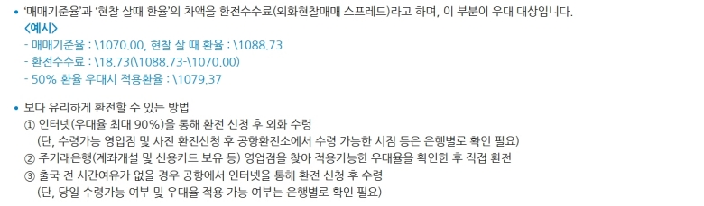 하지만 기본 수수료율이 전부는 아니에요. 진짜 절약은 '우대율'에서 결정되거든요. 수수료는 기준 환율과 실제 우리가 사는 환율의 차이, 즉 '스프레드'라고도 불리는데, 우대율은 바로 이 스프레드를 할인해 주는 거예요. 50% 우대를 받으면 수수료의 절반만 내는 셈이죠. 그래서 요즘엔 은행 앱을 통한 인터넷 환전을 많이 이용해요. 주요 통화는 최대 90%까지 우대율을 적용해 주는 경우가 많아서 창구에서 바꾸는 것보다 훨씬 이득이에요.