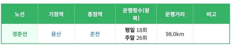 노선을 좀 더 자세히 들여다보면, 핵심 구간은 역시 경춘선이에요. 용산역에서 춘천역까지 총 운행 거리는 98.0km에 달해요. 운행 횟수도 알아두면 좋은데, 평일에는 왕복 18회, 주말에는 이보다 늘어난 왕복 26회 운행해요. 주말에 이용객이 많은 걸 고려해서 증편 운행하는 거죠. 저는 주말에 표를 못 구할 뻔한 적이 있어서, 미리 운행 횟수를 확인하고 예매하는 편이에요.