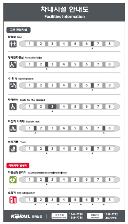 장거리 이동은 아니지만, 열차 내 편의시설도 미리 알아두면 편리해요. 화장실은 1, 2, 4, 5, 7, 8호차에 있고, 장애인 화장실은 3호차와 6호차에 있어요. 아기와 함께라면 3, 6호차의 수유방을 이용할 수 있고요. 자전거를 가지고 타는 분들을 위해 1호차와 8호차에는 자전거 거치대도 마련되어 있어요. 이런 시설 위치를 미리 파악해두면 필요할 때 당황하지 않고 바로 찾아갈 수 있겠죠?