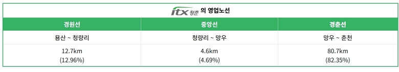 ITX-청춘이 지나는 전체 노선은 사실 세 개의 노선이 합쳐진 거예요. 용산에서 청량리까지는 경원선(12.7km), 청량리에서 망우까지는 중앙선(4.6km), 그리고 망우에서 춘천까지가 우리가 흔히 아는 경춘선(80.7km) 구간이죠. 전체의 82% 이상이 경춘선 구간이라 경춘선 열차로 불리는 거예요. 이렇게 구간별로 나뉘어 있다는 걸 알면 노선에 대한 이해가 더 깊어지더라고요.