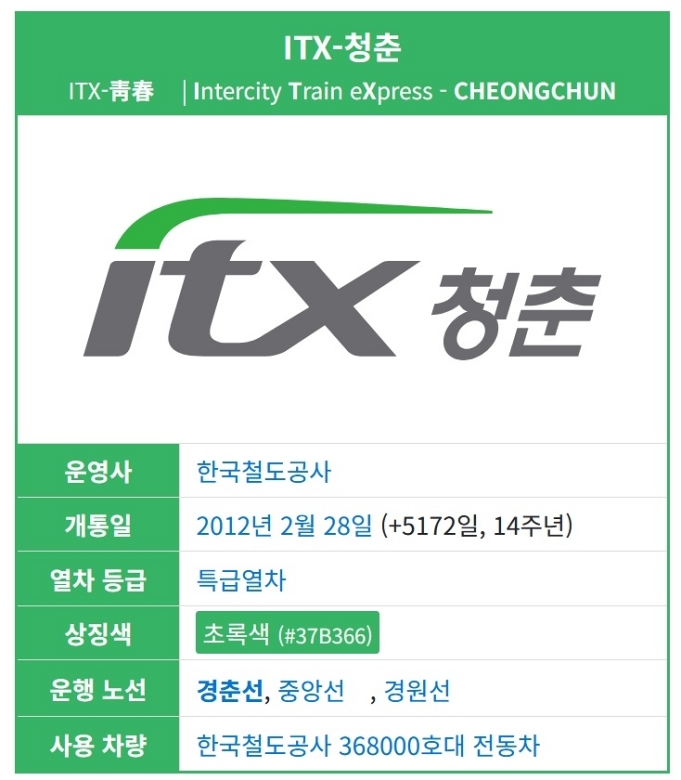 먼저 ITX-청춘이 어떤 열차인지 기본 정보부터 살펴볼게요. 이 열차는 한국철도공사에서 운영하는 특급열차로, 2012년에 운행을 시작했어요. 상징색은 초록색이고, 이름에서도 알 수 있듯 경춘선을 중심으로 중앙선과 경원선 일부 구간을 지나간답니다. 368000호대 전동차를 사용하는데, 이런 기본 정보를 알아두면 열차를 이용할 때 좀 더 친숙하게 느껴지더라고요.