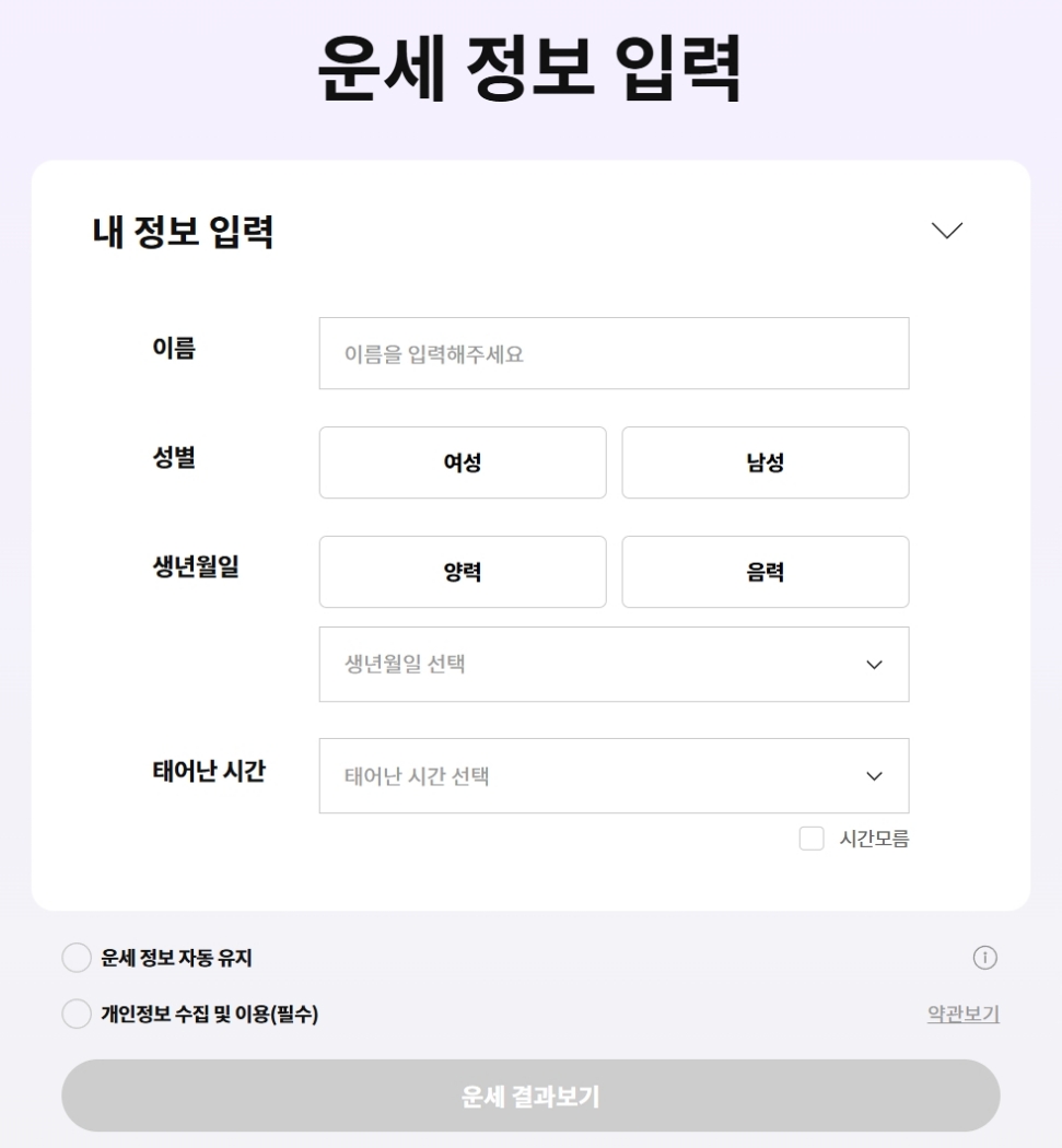 운세는 개인의 정보에 따라 달라지기 때문에, 결과를 보려면 몇 가지 정보를 입력해야 해요. 이름, 성별, 생년월일, 태어난 시간을 각각의 칸에 맞게 넣어주세요. 특히 생년월일은 양력과 음력을 구분해서 선택해야 더 정확한 결과를 얻을 수 있으니, 이 부분을 꼭 확인하고 넘어가시는 게 좋아요.