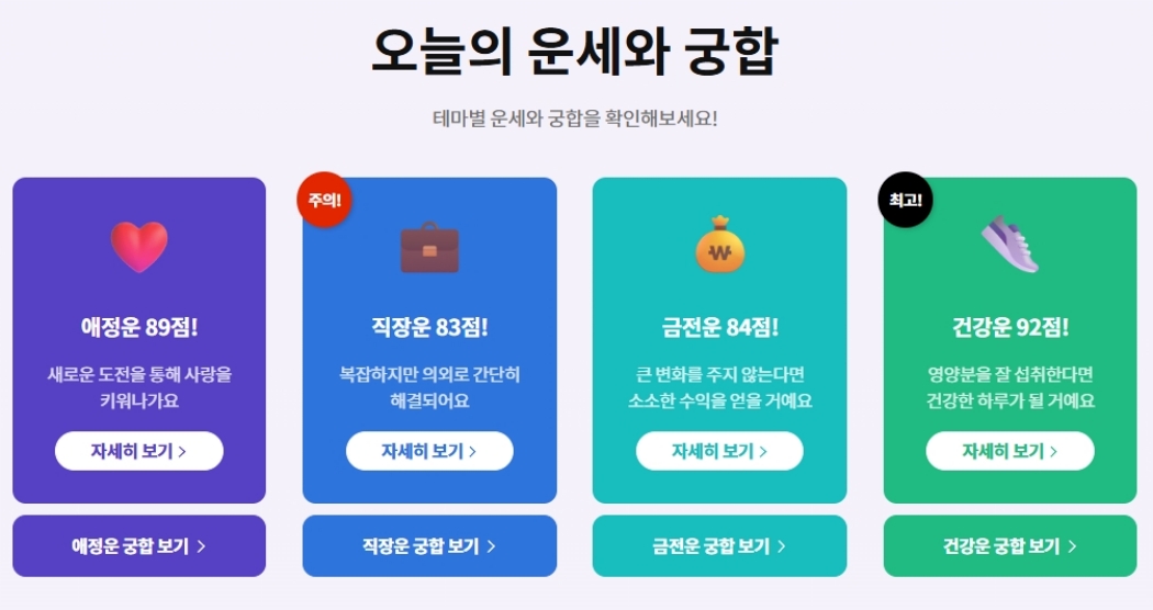 종합 결과 화면에서는 네 가지 운세가 각각의 네모 칸에 보기 좋게 정리되어 있어요. 점수와 함께 간단한 요약 문구가 적혀 있어서 오늘 하루의 전반적인 흐름을 빠르게 파악할 수 있죠. 만약 특정 운세에 대해 더 깊이 알고 싶다면, 각 항목 아래에 있는 '자세히 보기'를 선택해서 추가적인 내용을 확인하면 됩니다.