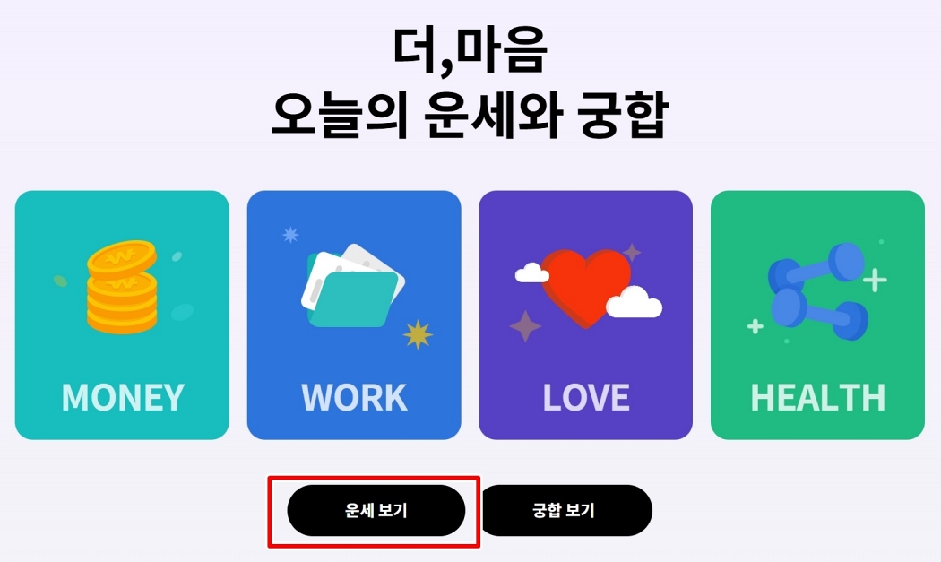 이제 '오늘의 운세와 궁합'을 볼 수 있는 화면으로 넘어왔어요. 화면 중앙에 재물, 일, 사랑, 건강을 나타내는 네 가지 그림이 보일 텐데요. 나의 종합적인 운세를 확인해야 하니, 그 아래에 있는 두 개의 버튼 중에서 왼쪽에 있는 '운세 보기'를 선택해 주세요.