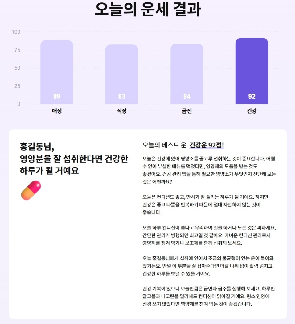 모든 정보를 입력하고 나면 드디어 오늘의 운세 결과를 확인할 수 있습니다. 애정, 직장, 금전, 건강운이 각각 점수와 함께 막대그래프로 표시되어 한눈에 파악하기 편해요. 그리고 화면 아래쪽에는 각 항목에 대한 상세한 설명이 나와 있어서, 오늘 어떤 부분을 신경 써야 할지 구체적인 조언을 얻을 수 있답니다.