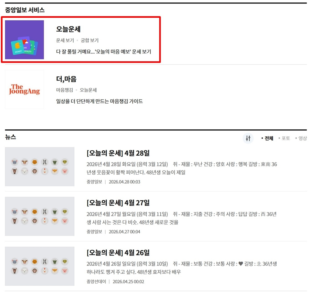 '중앙일보 서비스' 영역을 찾으셨다면, 그 안에서 '오늘운세'라는 메뉴를 선택해 주세요. 이미지와 함께 '다 잘 풀릴 거예요…'라는 문구가 적혀 있어서 쉽게 알아볼 수 있답니다. 여기가 바로 오늘의 운세를 본격적으로 확인할 수 있는 곳으로 들어가는 입구라고 생각하시면 돼요.