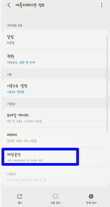3. 애플리케이션 정보에서 ‘저장공간’을 찾아서 이동합니다.