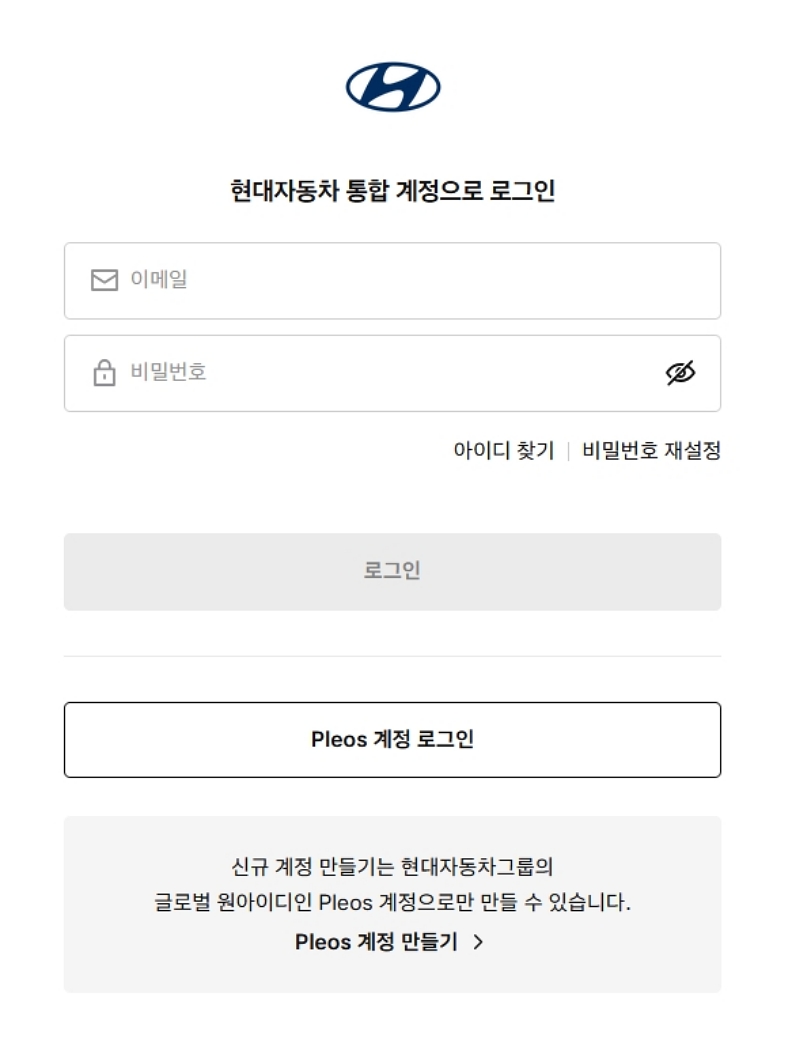 '확인'을 선택하면 이렇게 로그인 화면으로 이동해요. 기존에 현대자동차 통합 계정이 있으신 분들은 이메일과 비밀번호를 입력해서 로그인하시면 되고요. 만약 계정이 없다면 아래쪽 'Pleos 계정 만들기'를 통해 새로 만드셔야 이 기능을 쓸 수 있어요. 저 같은 경우에는 통합 계정이 있어서 바로 로그인했어요.