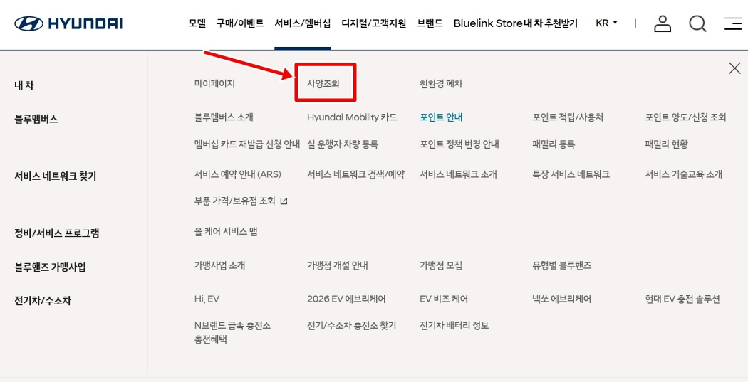 '서비스/멤버십'으로 마우스를 가져가면 아래로 여러 메뉴가 펼쳐지는데요. 여기서 '마이페이지' 카테고리 아래에 있는 '사양조회'를 선택해서 들어가시면 돼요. 저도 처음엔 어디 있는지 한참 찾았는데, 마이페이지 메뉴 쪽에 숨어 있더라고요. 다른 메뉴들도 많지만 일단 사양 조회가 목적이니 여기로 바로 들어가 볼게요.