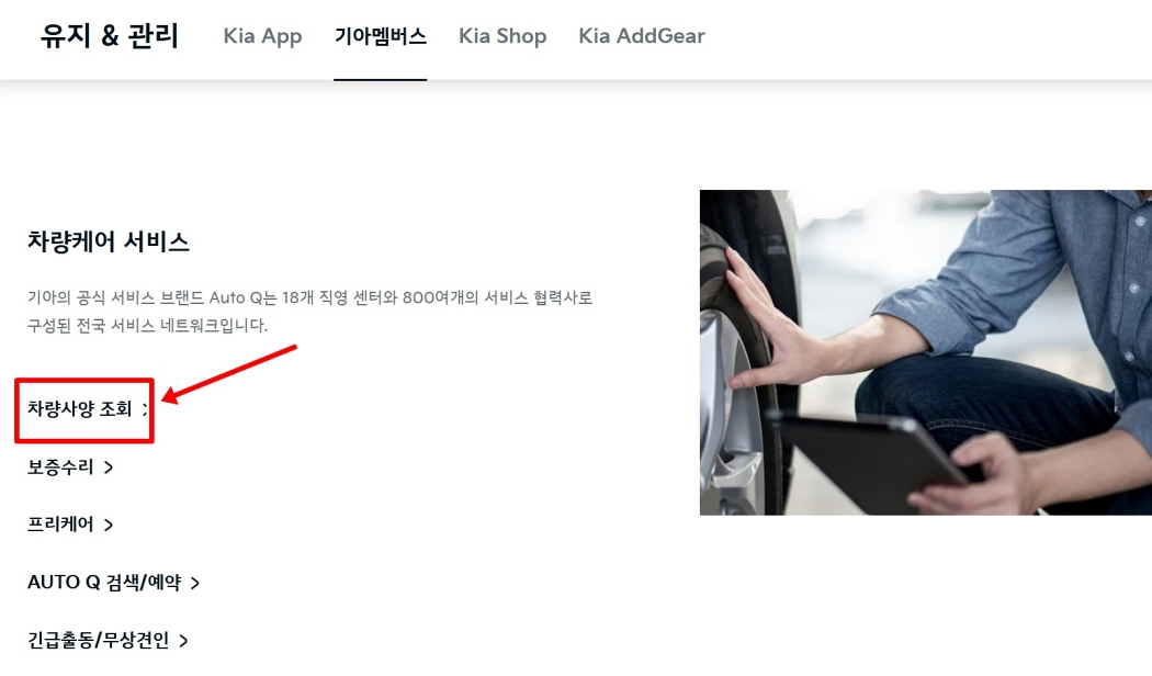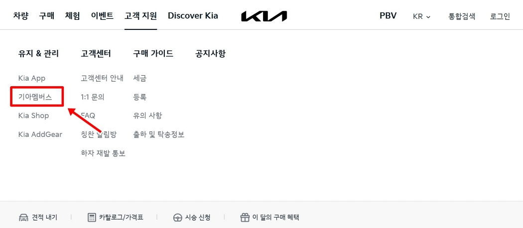 '고객 지원' 메뉴를 선택하면 '유지 & 관리', '고객센터' 등 여러 하위 카테고리가 나오는데요. 이 중에서 첫 번째 '유지 & 관리' 목록에 있는 '기아멤버스'로 들어가 주세요. 멤버십 회원들을 위한 전용 공간에 사양 조회 기능이 포함되어 있더라고요.