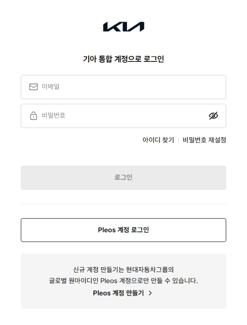 현대차와 마찬가지로 기아도 사양 조회는 로그인이 필요해요. '차량사양 조회'를 선택하면 바로 로그인 화면으로 넘어가는데요. 기아 통합 계정으로 로그인하면 됩니다. 만약 계정이 없다면 현대차와 동일하게 'Pleos 계정 만들기'를 통해 신규 가입 후 이용할 수 있어요.